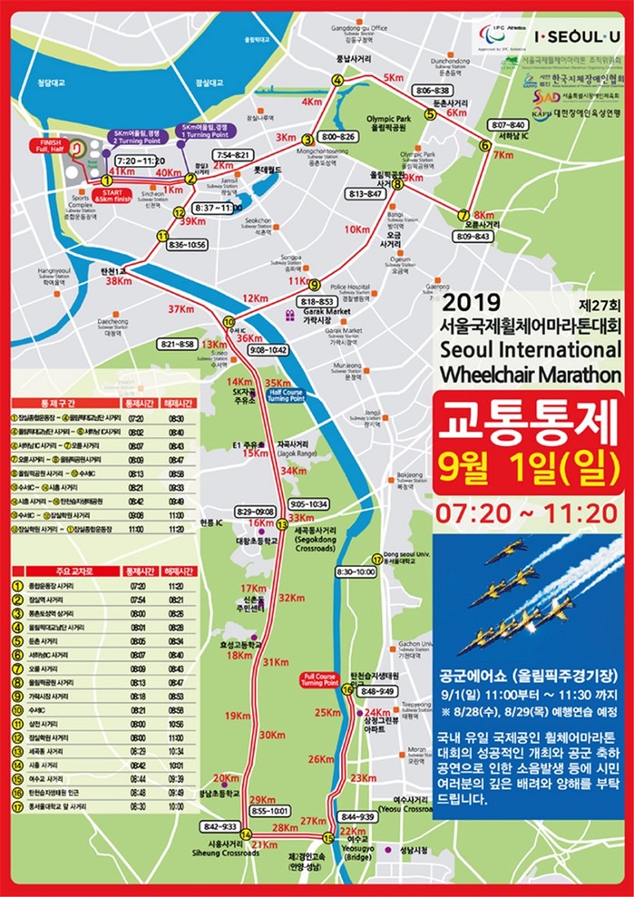 구체적인 교통통제시간과 교통통제에 따른 우회 도로 등 자세한 사항은 120 다산콜센터(국번없이 120), 서울국제휠체어마라톤대회 홈페이지(http://www.seoul-wheelchair marathon.or.kr)에서 확인할 수 있다.