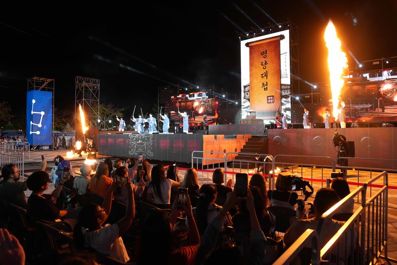 가장 큰 주목을 받은 주제공연은 해전 당시 판옥선을 재현한 초대형 무대와 첨단 디지털 기술, 배우들의 불꽃쇼 등 액션활극으로 관람객들에게 압도적 몰입감을 선사하며 뜨거운 호응을 얻었다. 8개 시군 수군들이 등장해 객석과 함께하는 장면, 장계 낭독, 전 관객이 함께한 한마당 놀이는 승리의 순간을 최고조로 끌어올리며 깊은 감동을 선사했다.