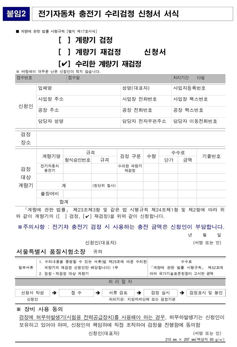 전기차 충전기 ‘수리검정’은 전기차 충전기의 계량 성능에 영향을 줄 수 있는 부분을 수리한 경우 계량값의 정확도를 검정하는 것으로, 산업통상부장관이 지정한 검정기관 및 지방자치단체가 수행할 수 있다. 검정기관은 주로 경기도에 소재하고 있으며, 지방자치단체 중에는 서울시가 최초로 시행한다.