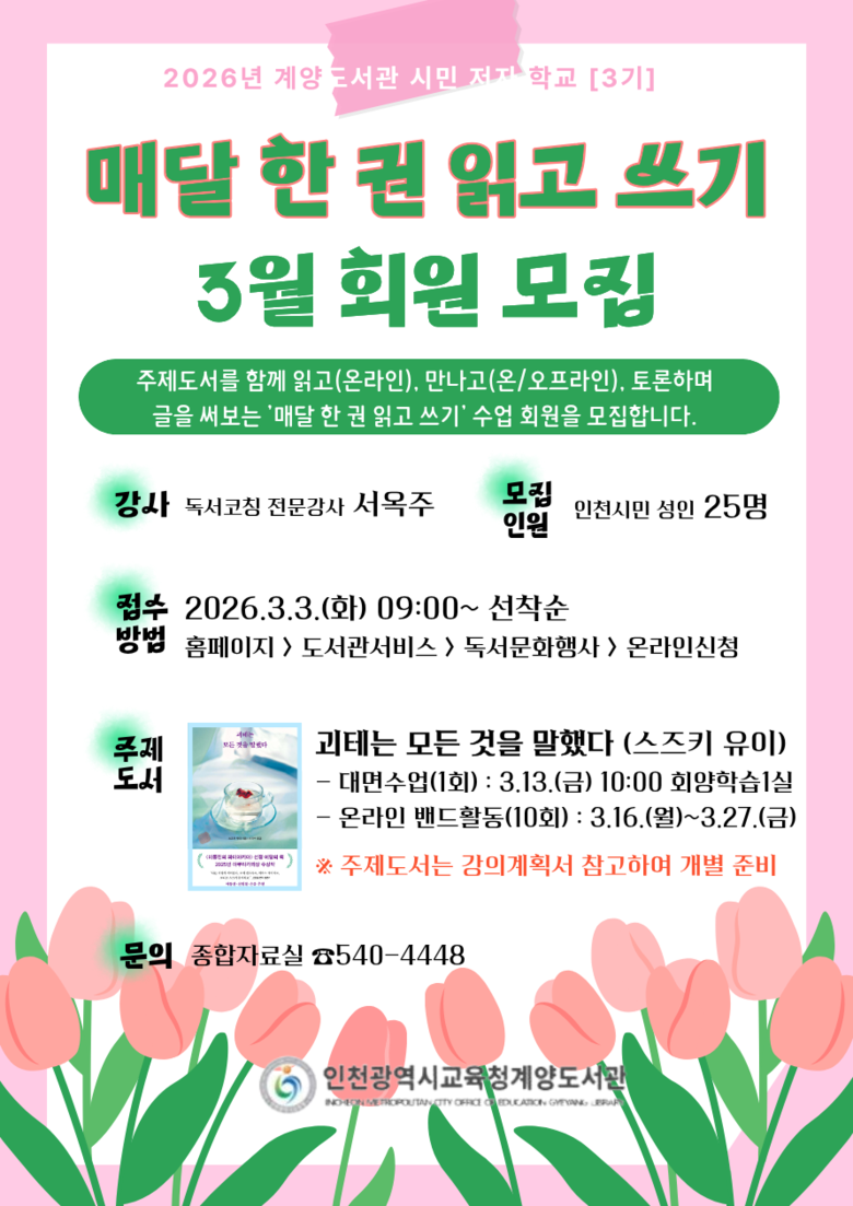 회원 모집은 계양도서관 누리집에서 접수 중이며, 자세한 사항은 종합자료실(☎032-540-4448)로 문의하면 된다.