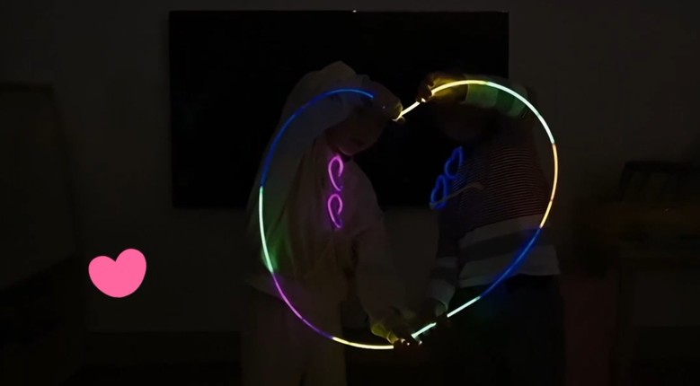 챌린지 영상 제작 과정에서 유아들은 놀이 중심 교육과정의 연계 활동인 ‘빛’ 놀이를 활용했다. 암막으로 조성된 교실에서 야광봉을 사용해 하트를 그려보며 창의성을 발휘했으며,“경기미래교육을 세계로!”라는 응원 문구를 직접 색칠해 카드섹션으로 표현함으로써 활동의 의미를 되새겼다.
