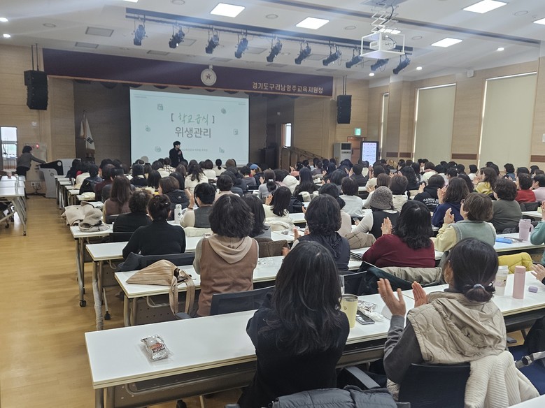이번 연수는 26일부터 28일까지 사흘간 관내 학교급식 조리종사자 700여 명을 대상으로 구리남양주교육지원청 대강당에서 실시하고 있으며, 학교급식실 현장 맞춤형 위생교육과 조리종사자 간의 원활한 의사소통 강화로 직장문화를 개선하는 데 중점을 두었다.