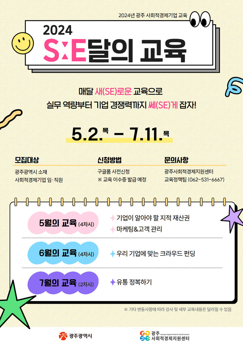광주시 소재 사회적경제기업 임·직원이면 누구나 참여 가능하며, 23일부터 온라인 링크(https://linktr.ee/GJSEC) 또는 광주사회적경제지원센터 누리집(www.gjsec.kr)을 통해 신청받고 있다.