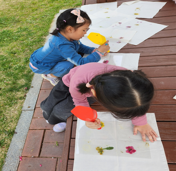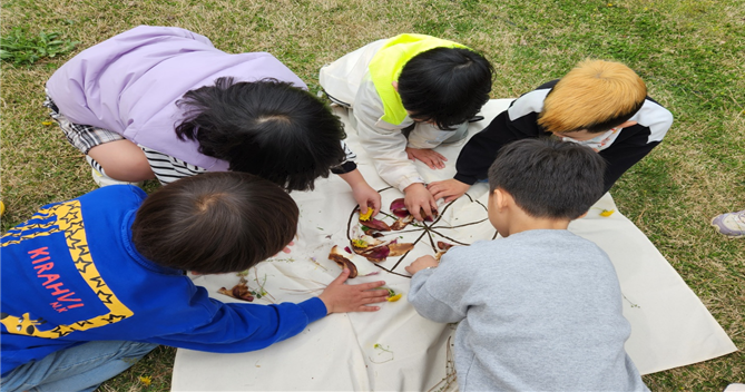 먼저, 유치원을 둘러보며 제비꽃과 같은 봄꽃들을 함께 살펴보고 그 꽃들의 생김새와 이름, 특징 등을 함께 알아보았다. 그 후, 꽃잎으로 천 물들이기, 민들레 반지 만들기, 봄꽃 엽서 만들기, 봄꽃 피자 만들기 등 봄꽃을 활용한 다양한 놀이가 이뤄졌다. 봄꽃의 매력에 흠뻑 빠진 아이들은 “봄 꽃향기가 너무 좋아서 나비랑 벌들이 찾아올 것 같아”, “그럼 내가 나비가 되어볼게.”하며 다 같이 벌과 나비로 변신해 이리저리 날아다녀 보기도 하였다.