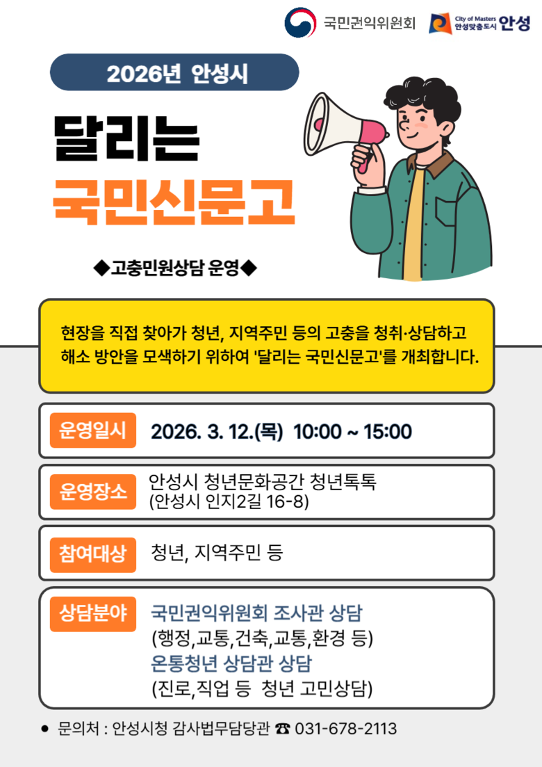 상담을 희망하는 청년이나 주민은 당일 현장에서 바로 접수할 수 있다. 사전 예약이나 기타 궁금한 사항은 안성시 감사법무담당관 조사팀(☎ 031-678-2113)으로 문의하면 된다.