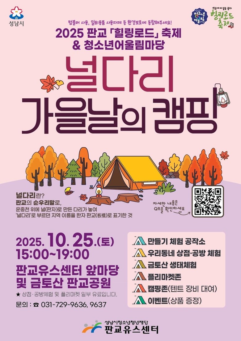 이번 행사는 “널다리 가을날의 캠핑”을 주제로 청소년과 지역주민이 함께 자연 속에서 어울리며 편안한 휴식과 문화예술을 즐기며 힐링할 수 있는 시간으로 마련한다. ‘널다리’는 순우리말로 운중천 위에 널판자로 만든 다리가 놓였던 지역의 유래에서 붙여진 판교의 옛 이름이다.