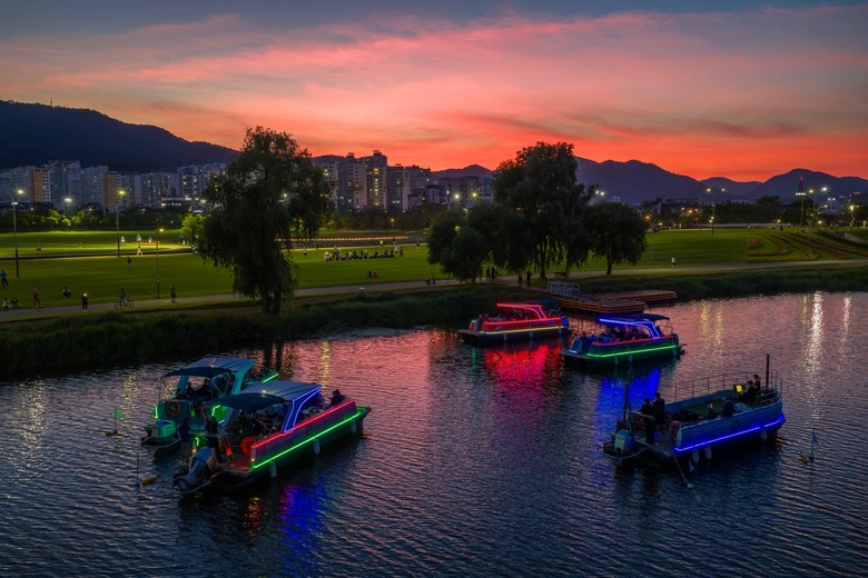 5척의 선박이 한꺼번에 출항하는 수상퍼레이드는, 15분 간격으로 운영되는 정기 운항과 동일하게 성인 기준 10,000원에 예약 가능하며, 해질녘에 출발해 선선한 바람을 맞으며 노을을 볼 수 있어 인기가 높다.