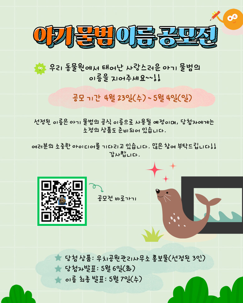 성창민 우치공원관리사무소장은 “아기 물범은 많은 시민에게 사랑받는 인기 동물”이라며 “이름공모전을 통해 시민과 동물 간 교감이 더욱 풍성해지길 기대한다”고 말했다.
