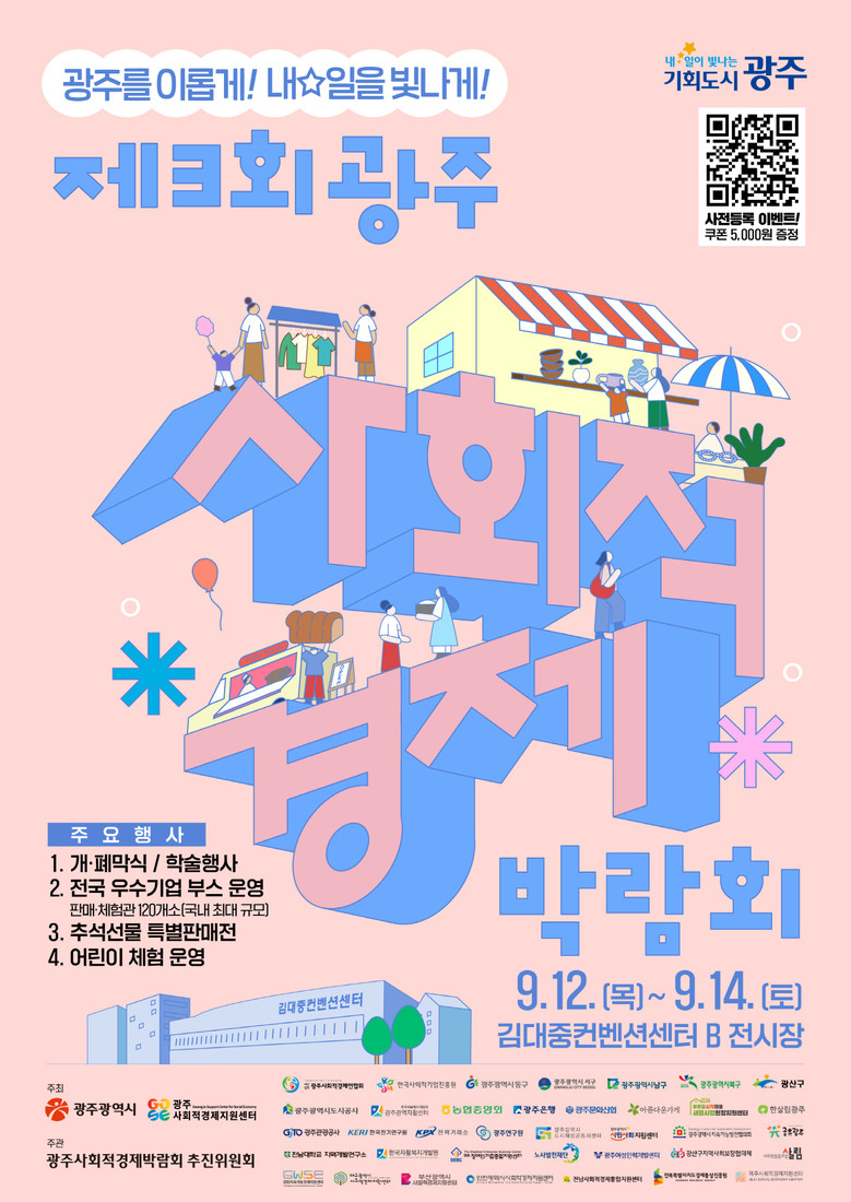 사전 이벤트로 오는 11일까지 광주사회적경제지원센터 누리집(https://gjsec.kr)을 통해 박람회 홍보이벤트를 진행한다. 사전 등록한 선착순 500명에게 박람회장에서 사용할 수 있는 5000원 쿠폰이 제공된다. 또 사회적경제기업 제품을 5만원 이상 구매하면 현장에서 사용할 수 있는 5000원 쿠폰을 현장에서 증정하는 이벤트도 열린다.