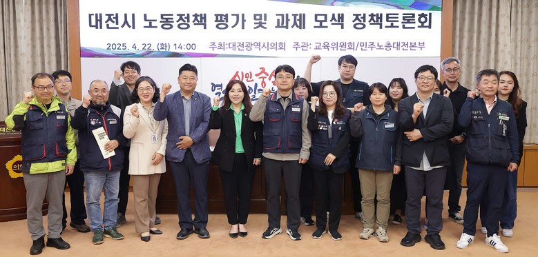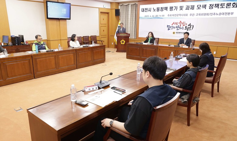 [대전 세계타임즈=이채봉 기자]대전시의회가 김민숙 의원(더불어민주당, 비례)을 좌장으로 22일 의회 소통실에서 ‘대전시 노동정책 평가 및 과제 모색 정책토론회’를 개최했다. 이번 토론회는 세계 노동절(메이데이)을 앞두고 노동 존중과 지역사회 책임을 실현하기 위한 실천적 논의의 장으로 마련됐다.