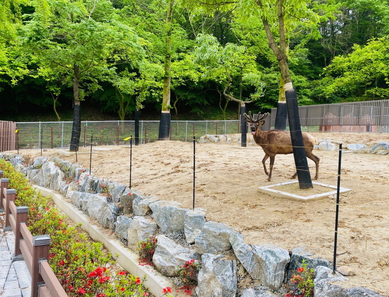 남유럽에 사는 ‘다마사슴의 고향’을 콘셉트로 새단장한 사슴사는 기존의 철조망을 없애고 함정(모트)을 설치해 관람로와 동물사를 구분했다. 또 바닥을 흙과 돌로 바꿔 친자연적으로 개선했다.