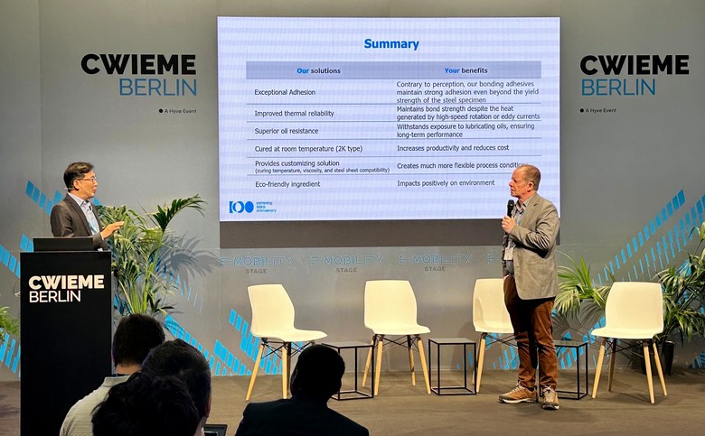 이 소장은 발표를 통해 전기차 모터코어 적층방식에서 접착제를 사용한 방식이 기존에 사용하던 체결방식(Interlock)과 용접방식 대비 전력손실과 소음발생 감소에 가장 효과적이라고 발표했다. 이어 친환경 소재 이소소르비드를 활용해 자체 개발한 친환경 접착제의 시험결과를 공개하며, 고효율의 전기차 모터에 요구되는 접착력, 열안정성, 내유성이 일반 제품 대비 우수해 전기차 모터코어 제작에 적합하다고 밝혔다. 또한 복잡하거나 작은 크기의 코어 제작에 효과적인 ‘셀프본딩’ 강판 코팅용 접착제 기술도 공개했다.