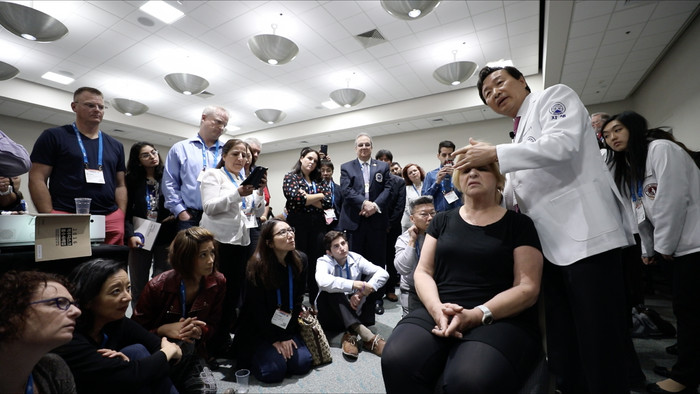 | ▲ 자생의료재단 신준식 명예이사장이 MD와 DO 등 국 의료계 전문가들을 대상으로 침치료 시연을 하고 있다. |
