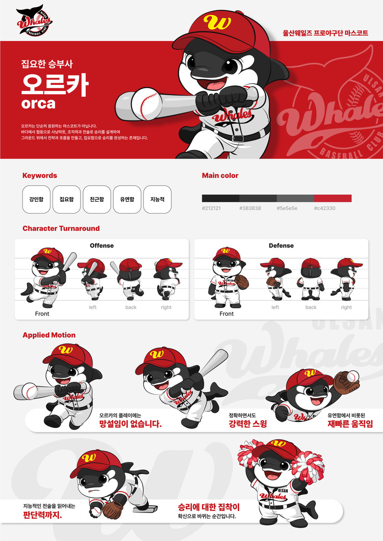 특히 대상작 ‘오르카’에 대해 “범고래와 야구의 역동적인 이미지를 효과적으로 결합해 작품성, 독창성, 활용성 측면에서 매우 우수하다”라며 “고래의 강인함을 부드럽고 귀여운 이미지로 표현해 대중에게 친근감을 주는 역동적인 마스코트로 완성됐다”라고 밝혔다.