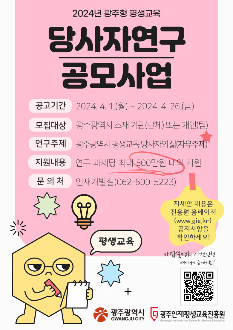 [광주 세계타임즈=손권일 기자] 광주광역시와 (재)광주인재평생교육진흥원(원장 이춘문, 이하 ‘진흥원’)이 오는 26일까지 지역 내 기관과 개인을 대상으로 <2024년 광주형 평생교육 당사자연구> 사업을 공모한다.