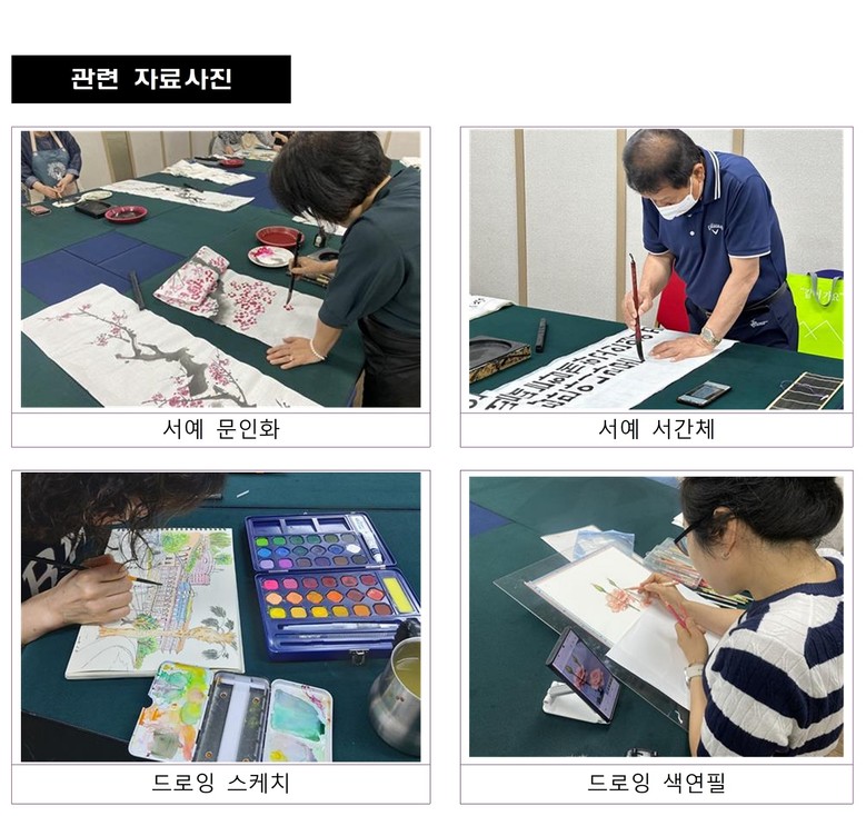 서예 수업은 한문, 한글, 서간체, 문인화, 전각 등 전통 예술의 멋과 현대적 감각을 함께 익힐 수 있으며 작품 완성과 예술적 성취감을 동시에 느낄 수 있도록 심화 과정을 포함해 운영된다.