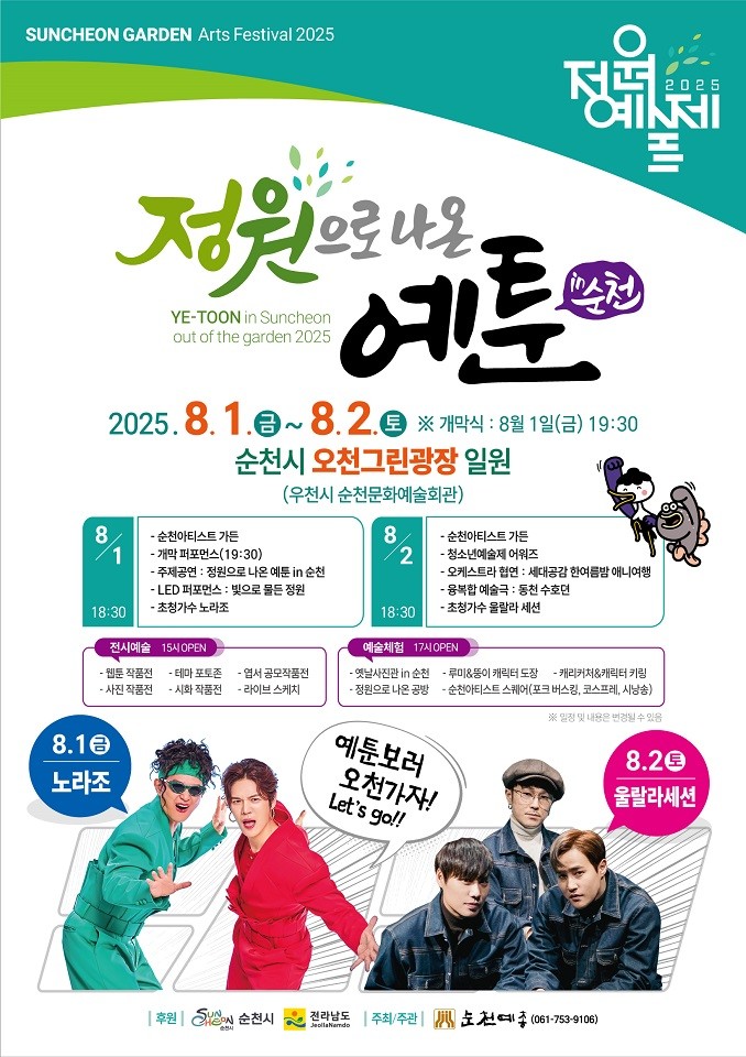 - 정원과 웹툰과 예술이 만나는 복합문화예술축제 - [순천시 세계타임즈=우덕현 기자] 순천시(시장 노관규)는 오는 8월 1일부터 2일까지 이틀간 오천그린광장에서 <정원으로 나온 예툰 in 순천>을 주제로 ‘2025 정원예술제’를 순천예총 주관으로 개최한다고 밝혔다.