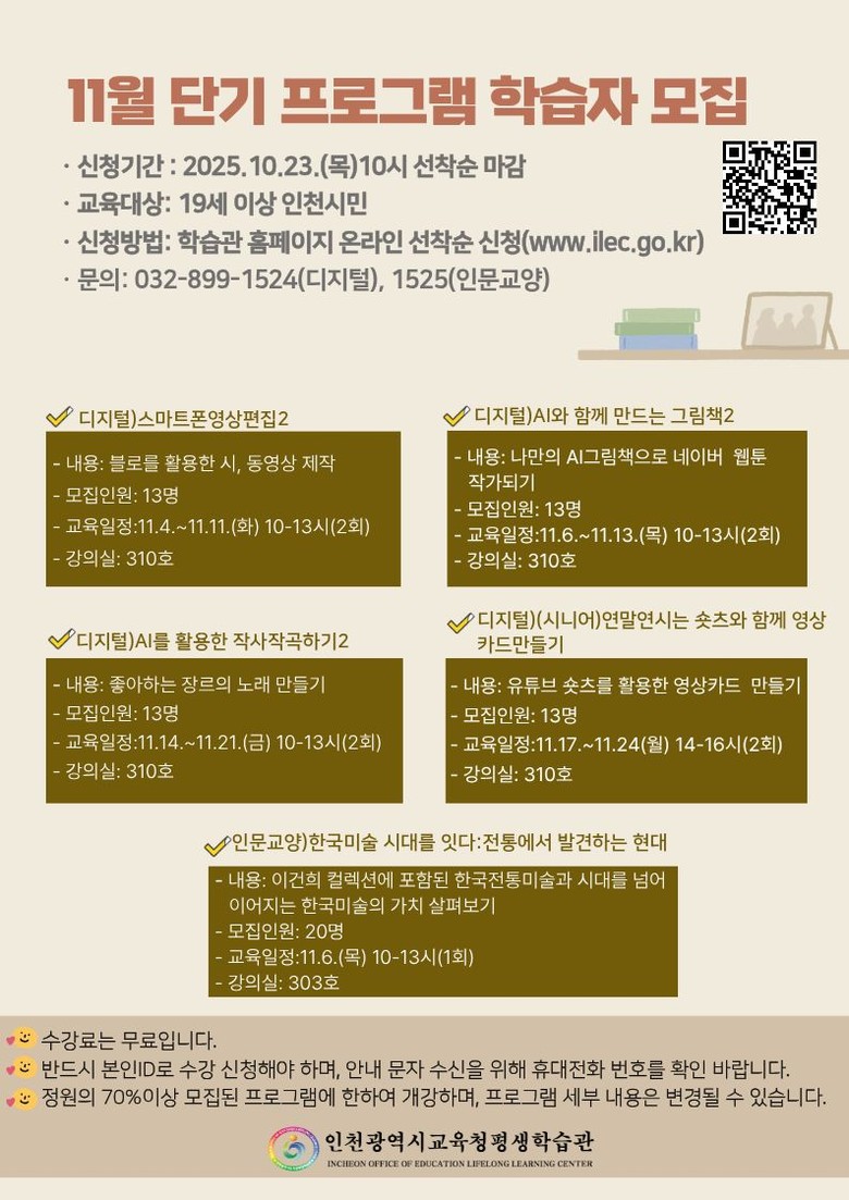 운영 강좌는 ▲스마트폰영상편집2 ▲AI(인공지능)와 함께 만드는 그림책2 ▲AI(인공지능)를 활용한 작사·작곡하기2 ▲(시니어) 연말연시는 숏츠와 함께 영상 카드 만들기 ▲한국미술 시대를 잇다: 전통에서 발견하는 현대 등 5개다.