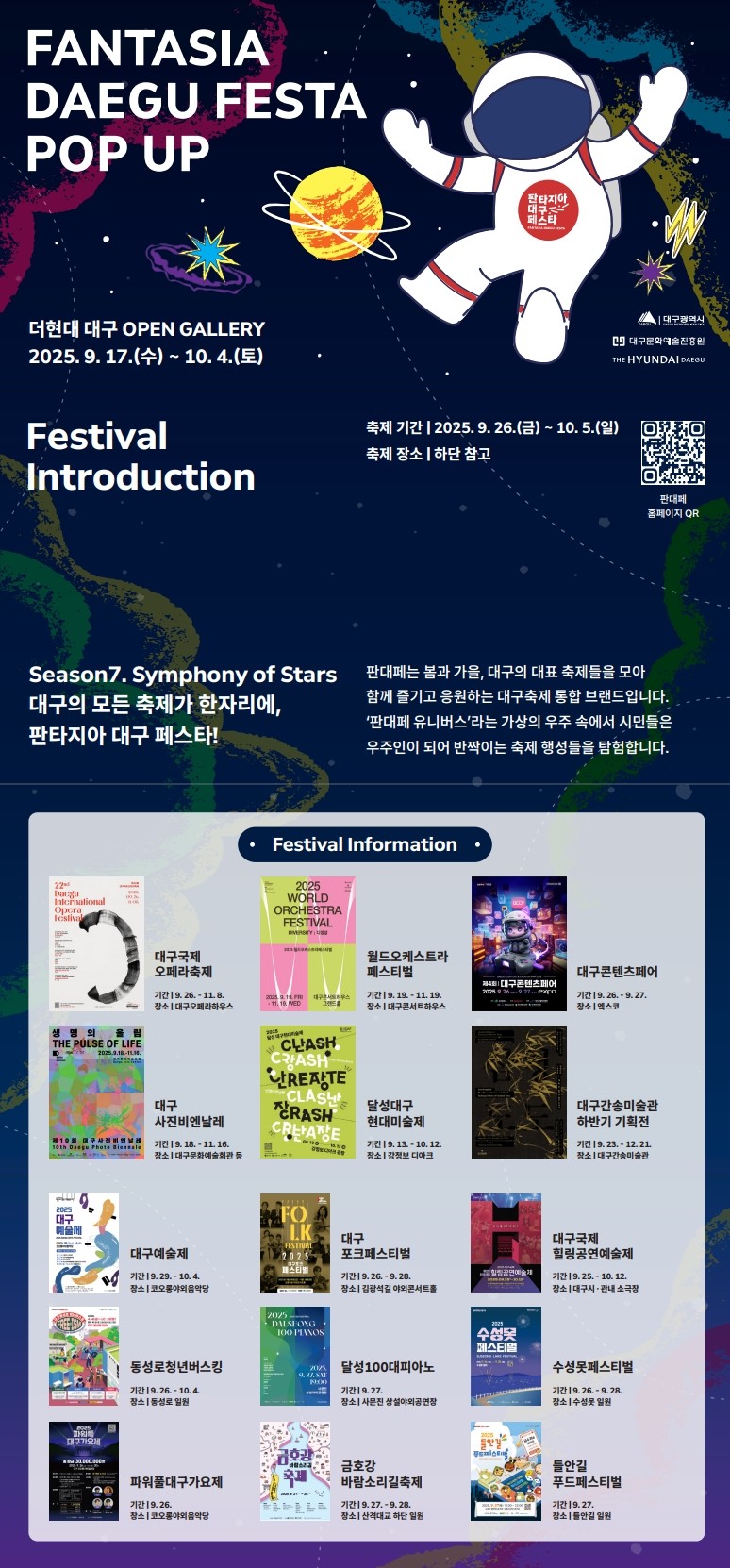 대구시가 주최하고 (재)대구문화예술진흥원이 주관하는 ‘2025 판타지아대구페스타(이하 판대페)’의 가을 축제 팝업전시가 오는 9월 17일(수)부터 10월 4일(토)까지, 더현대대구 지하1층 오픈갤러리에서 개최된다.