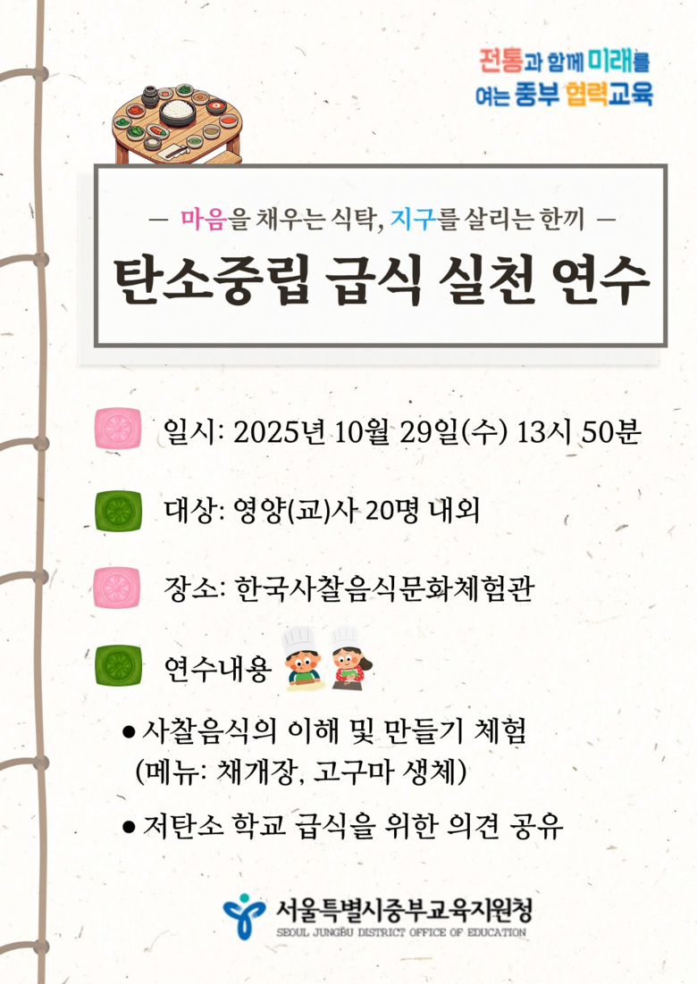 연수는 ▲사찰음식의 이해 및 조리 체험(채개장, 고구마 생채) ▲탄소중립 급식 운영 사례 공유 ▲학교급식 관계자 간 소통의 시간 등으로 구성되어 있으며, 참가자들은 이번 연수를 통해 환경을 고려한 식단 운영 방법을 탐색하고, 학교 현장에서 적용 가능한 저탄소 식생활 실천 아이디어를 함께 나눌 예정이다.