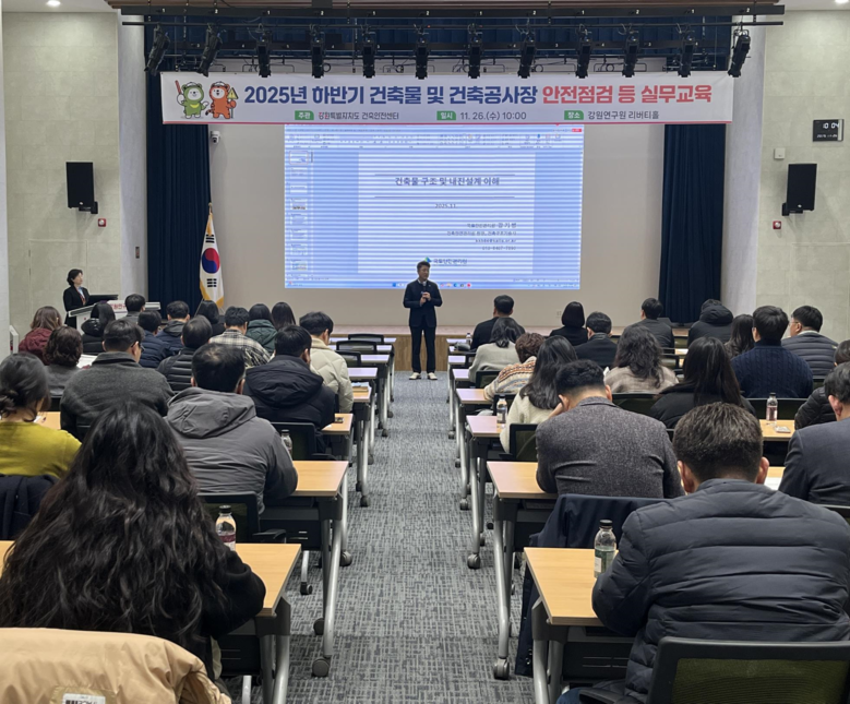 [강원도 세계타임즈=김민석 기자] 강원특별자치도(도지사 김진태)는 최근 전국적으로 건축현장에서 중대재해 사고가 잇따라 발생함에 따라 건축분야 안전점검 실무자의 전문성과 현장 대응능력 강화를 위해 11월 26일(수) 강원연구원 리버티홀에서 「건축물 및 건축공사장 등 안전점검 실무교육」을 실시했다고 밝혔다.