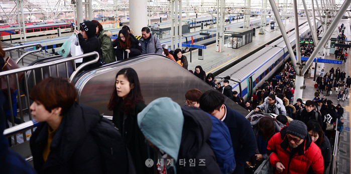 설 연휴 사흘째 본격적인 귀경행렬이 이어진 29일 오전 서울역에서 귀경객이 기차역 플랫폼을 빠져나오고 있다. 2017.01.29.