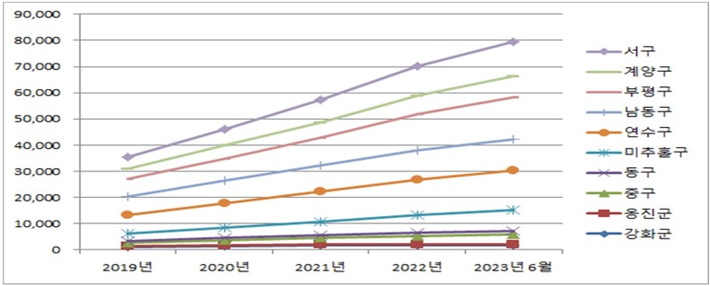 군·구별로는 서구 213.5%, 미추홀구 177.3%, 중구 174.7%, 동구 147.9%, 부평구 137.5%, 연수구 111.0%, 계양구 88.8%, 남동구 75.1%, 강화군 55.1%, 옹진군 26.4% 등으로 서구가 가장 높은 증가율을 보였고, 옹진군이 가장 낮은 증가율을 나타냈다.