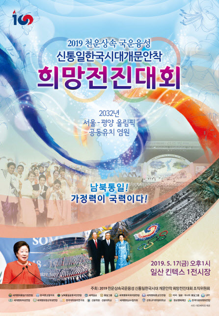 [세계타임즈 이연숙 기자] 세계평화통일가정연합 중심으로 이루어진 ‘2019 신통일한국 희망전진대회 조직위원회’는 3.1운동 100주년 및 임시정부 수립 100주년을 맞아 새로운 100년을 향한 한반도 평화통일을 결의하는 ‘2019 천운상속 국운융성 신통일한국시대개문안착 희망전진대회를 17일 오후 1시 고양시 일산 킨텍스 제1전시장에서 개최한다고 밝혔다.