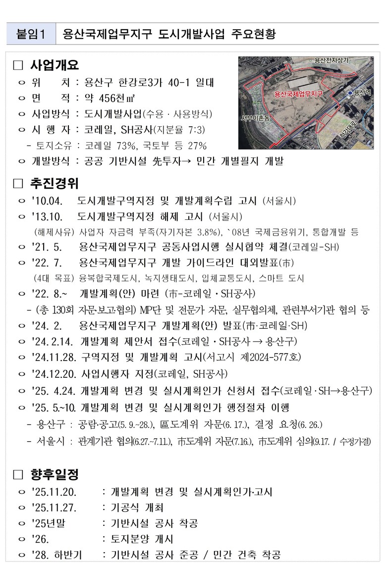 다만, 용산국제업무지구 개발이 가져올 경제적 파급 효과와 서울의 글로벌 도약 기회임을 고려, 국가 경쟁력 강화와 글로벌 비즈니스 중심지로서의 위상 제고라는 당초의 계획 취지를 유지한다는 방침이다.