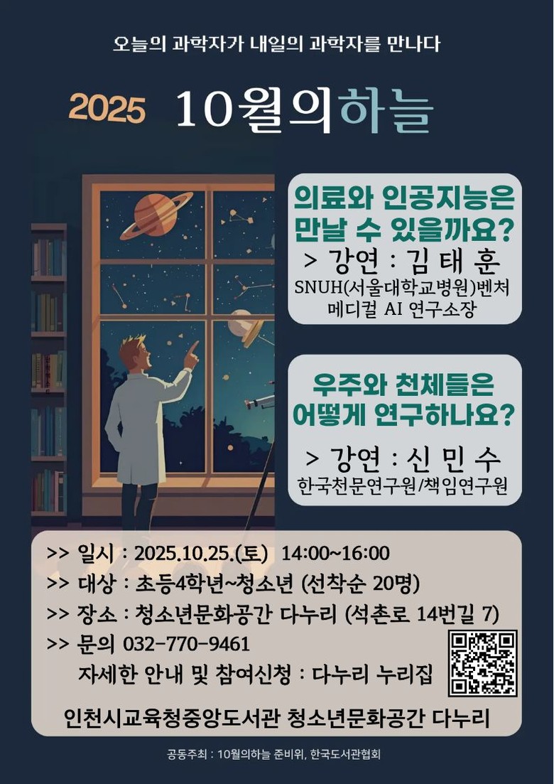 이번 프로그램은 과학자들의 재능기부 강연으로 참여해 시민들과 과학을 나누는 행사로 한국도서관협회와 10월의 하늘 준비위원회가 공동 주최한다.