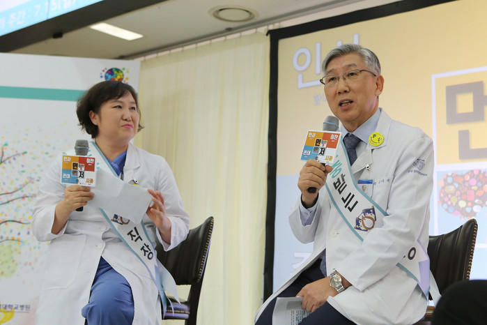 | ▲존중 배려의 조직문화에 대한 대담을 진행 중인 김기택 의무부총장(右)과 송주영 노사협의회위원장(左) |