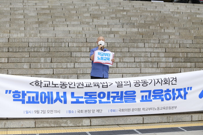 윤 의원은 이날 노동계·교육계·학계 등 168개 단체로 구성된 학교부터 노동교육운동본부와 함께 토론회를 열고, 오랜 숙의 끝에 "학교노동인권교육법"을 마련, 2일 발의한다. 그리고 국회에서 "학교노동인권교육법"을 심사해 통과를 촉구하는 자리를 마련했다.