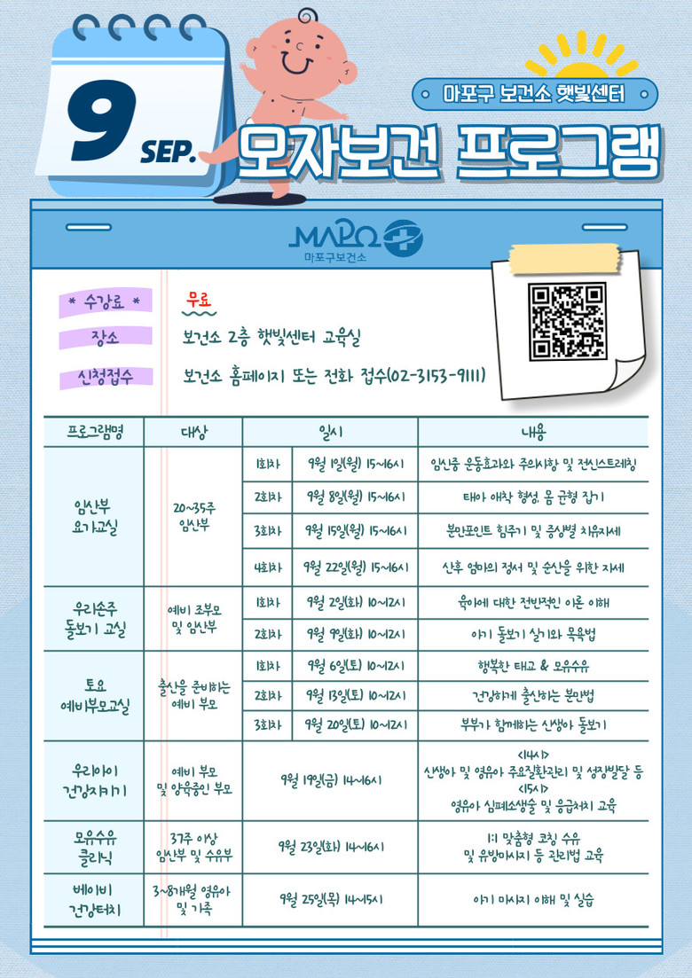 9월에는 토요예비부모교실, 임산부 요가교실, 모유수유클리닉, 우리아이건강지키기교실, 베이비건강터치교실, 임산부 및 영유아 영양교육, 우리손주돌보기교실 등 다양한 프로그램이 마련됐다