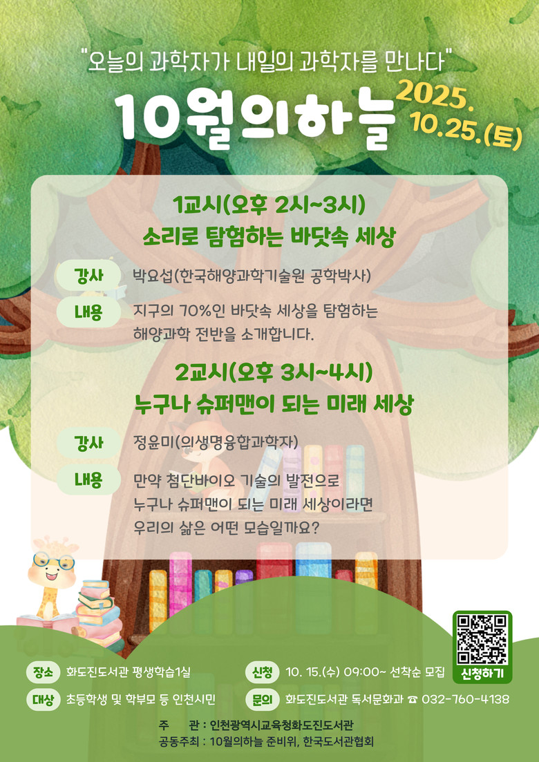 이번 강연은 화도진도서관 평생학습1실에서 열리며, ▲오후 2시 박요섭 한국해양과학기술원 공학박사의 ‘소리로 탐험하는 바닷속 세상’ ▲오후 3시 정윤미 의생명융합과학자의 ‘누구나 슈퍼맨이 되는 미래 세상’이 진행된다.