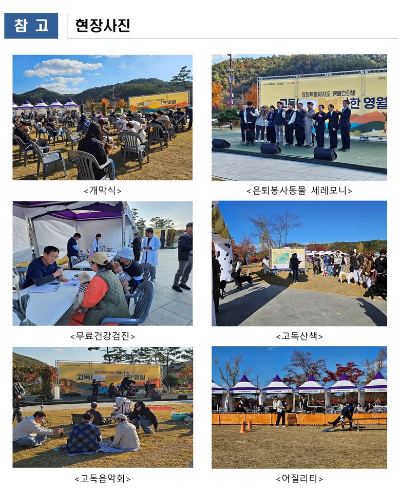 주요 프로그램으로는 연당원 둘레길을 함께 걷는 「고독 산책(GO DOG Walks)」, 해질녘 잔디광장에서 열린 「고독 음악회」, 무료 건강검진, 펫셀럽 시장(마켓), 반려견 동반 캠핑 등이 운영돼 반려인과 반려동물이 함께 즐길 수 있는 다채로운 체험의 장이 마련됐다.