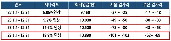 전국경제인연합회(이하, 전경련)는 최남석 전북대 교수에게 의뢰해 진행한「최저임금 상승이 일자리에 미치는 영향(2022)」보고서를 통해 내년도 최저임금 인상률에 따른 시나리오별 일자리 감소 규모를 제시했다.
