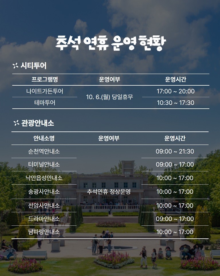 시 관계자는 “올해 추석 연휴는 순천 전역이 하나의 거대한 문화·관광 특집 무대가 된다”며 “관광객들에게는 잊지 못할 추억을, 시민들에게는 풍성한 명절 분위기를 선사하겠다”고 말했다.