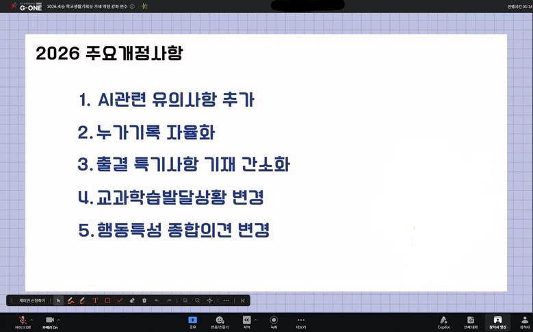◦ 초등 학교생활기록부 신뢰도 향상 및 공정성 확대 [파주시 세계타임즈=송민수 기자] 경기도파주교육지원청(전선아 교육장)은 3월 19일(목), 경기도교육청 업무협업G-ONE 플랫폼을 기반으로 ‘2026학년도 초등 학교생활기록부 기재 역량 강화 연수’를 비대면으로 실시하였다.