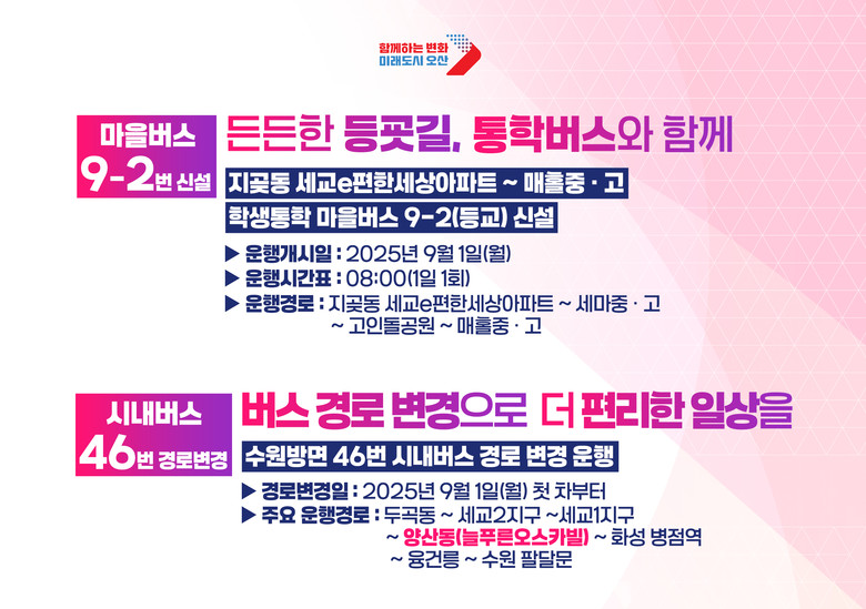 오산시는 이번 조치에 그치지 않고, 앞으로도 오산 전역의 이동 편의를 높이기 위한 정책을 지속적으로 발굴, 시민 맞춤형 노선 확충을 단계적으로 추진해 나갈 계획이다.
