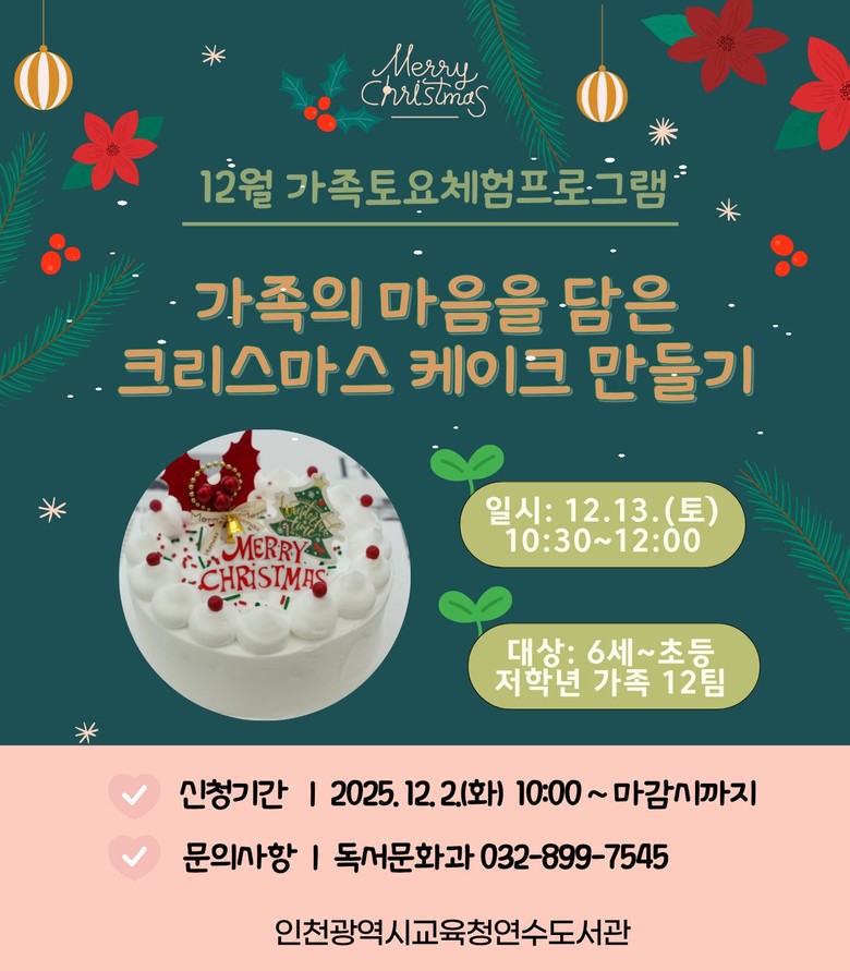 이번 프로그램은 6세부터 초등 저학년 자녀와 부모가 함께 크리스마스 케이크를 만드는 체험 강좌로, 크림 데코레이션과 토핑 꾸미기 등 기초 베이킹 활동을 진행한다.