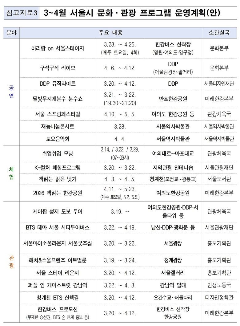 2026 서울스프링페스티벌(4.10.~5.5.), 동대문디자인플라자(DDP) 뮤직라이트쇼(4.6.~4.12.), K-pop 성지 도보관광코스(3.19.~), 서울스테이 라운지(3.20.~4.12.) 등을 3~4월 집중운영한다.