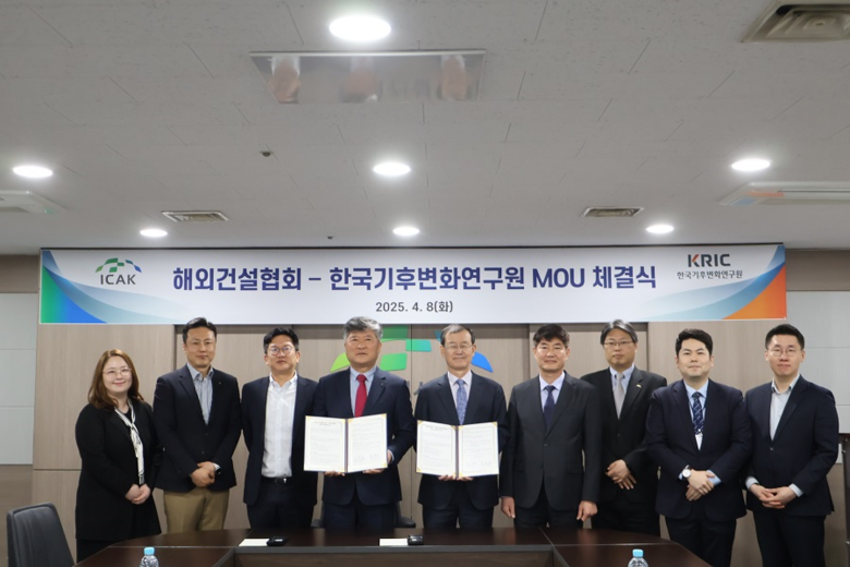 [강원도 세계타임즈=김민석 기자] 한국기후변화연구원(이사장 김진태)은 4월 8일(화), 해외건설협회(회장 한만희)와 글로벌 기후변화 대응 및 국가 탄소중립 달성에 기여하기 위한 업무협약을 체결했다고 밝혔다.