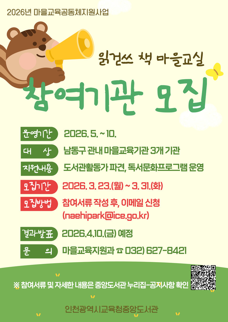 참여를 희망하는 기관은 3월 23일부터 31일까지 이메일(naehipark@ice.go.kr)로 신청 가능하며, 자세한 내용은 중앙도서관 누리집 공지사항을 확인하거나 마을교육지원과(☎032-627-8421)로 문의하면 된다.