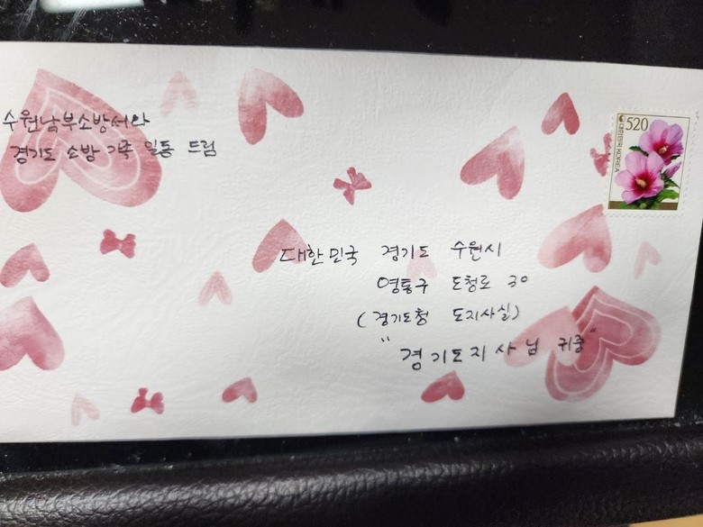 이번 소방관들의 편지는 김동연 지사의 수원남부소방서 방문에 맞춰 급하게 작성된 의전용은 아닌 것으로 보입니다. 편지봉투에 우표가 붙어 있었기 때문입니다.