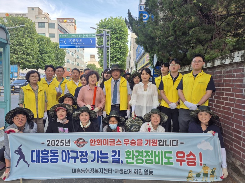 이번 환경정비는 주민 및 야구 경기 관람객들에게 쾌적한 보행 환경을 제공하기 위해 대흥동 네거리부터 충무로 네거리까지 이어지는 약 620m 구간을 대상으로 진행되었다. 참여자들은 무더운 날씨에도 잡초 및 낙엽 제거 등 인도 주변을 집중 정비하며 구슬땀을 흘렸다.