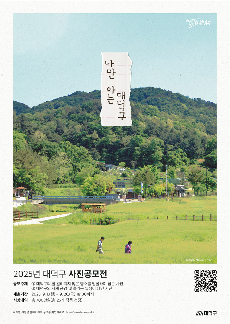 최충규 대덕구청장은 “이번 공모전을 통해 대덕구의 자연, 문화, 사람 등 다양한 가치를 발견하고 함께 공유하는 계기가 되기를 바란다”고 말했다.