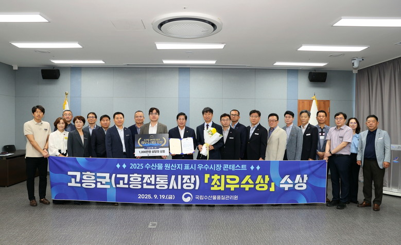 [고흥군 세계타임즈=우덕현 기자] 고흥군(군수 공영민)은 고흥전통시장이 ‘2025 수산물 원산지 표시 우수시장 콘테스트’에서 전국 최고의 시장을 입증하는 최우수상을 수상했다고 22일 밝혔다.
