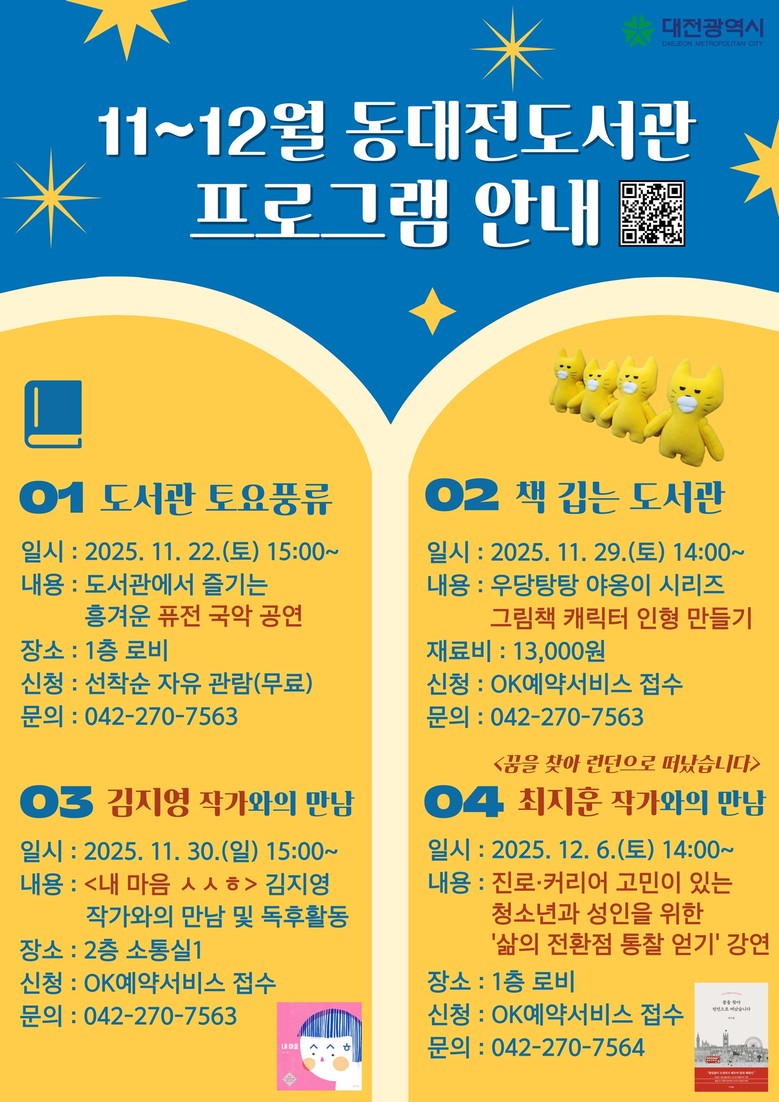 모든 프로그램은 OK예약서비스를 통해 신청할 수 있으며, 공연은 선착순 무료 관람으로 참여 가능하다. 자세한 내용은 동대전도서관 홈페이지 참고 및 전화(042-270-7554)로도 문의 가능하다.
