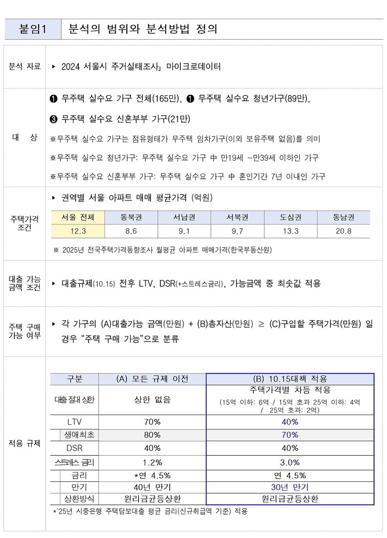 정종대 서울시 부동산정책개발센터장은 “최근 정부 대출 규제로 내 집 마련 자금조달 여력의 변화를 살펴본 이번 분석을 통해 실거주 목적의 청년, 신혼부부의 주택 구매 기회를 확대해 주기 위해선 신용 보강 등 추가적 지원이 필요하다는 사실을 확인했다”며 “또 임차 가구는 민간.공공 임대 공급을 통한 안정적 거주 기반을 강화하는 등 다층적인 대응이 필요할 것”이라고 강조했다.