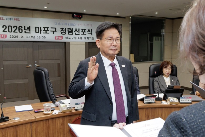 구는 지난 2월 3일, ‘2026 마포구 청렴선포식’을 열고, 박강수 마포구청장을 비롯한 5급 이상 간부공무원, 산하기관장이 함께 청렴한 공직문화 조성을 위한 실천 의지를 다졌다.